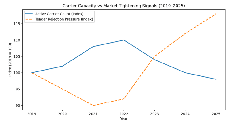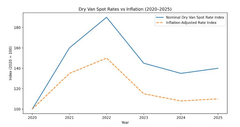 Even though the spot market got better in late 2025, truckload prices are still much lower than they were at their highest point in the last cycle when adjusted for inflation. During the 2021–2022 surge, many dry van spot lanes briefly went over $3.00 per mile on a nominal basis.
